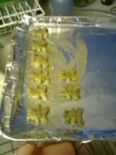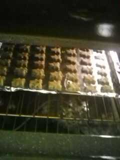 Precalentar el horno a 350 y pone sus delicias en una hoja de hornear engrasada sin. Pongo papel aluminio encima mía para fácil limpieza. Hornear durante 20 minutos o hasta que estén crujientes y doradas. (marrón de oro puede ser difícil de detectar por el color marrón de la masa así atención)