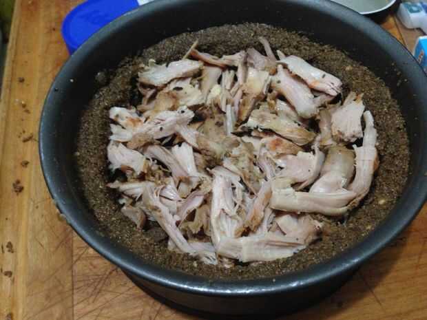 Rellenar la corteza con algunos de los dulces favoritos de su perro. Usé pollo y mantequilla de maní en éste.