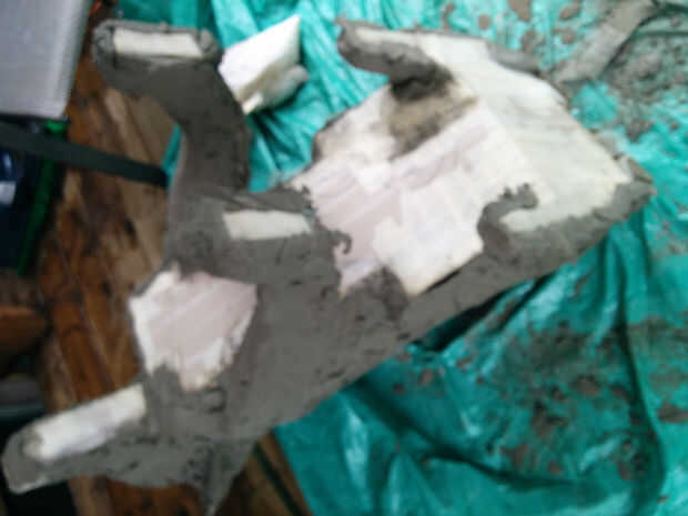 El hormigón estaba teniendo un momento difícil que se pega a la parte inferior del hocico y torso lo dio para arriba y esperó hasta el día siguiente. Me volcó el perro y continuó aplicando la capa rayada. Lo dejé secar en esa posición bajo una lona.