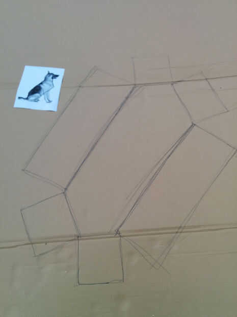 Tener un buen día soleado me extendió la caja en el césped y analizó la escultura perro en 3 componentes principales: cuerpo, hocico y patas. Orejas y patas traseras fueron adjuntos rápidamente. He añadido bridas a la forma básica para crear la profundidad de las unidades.