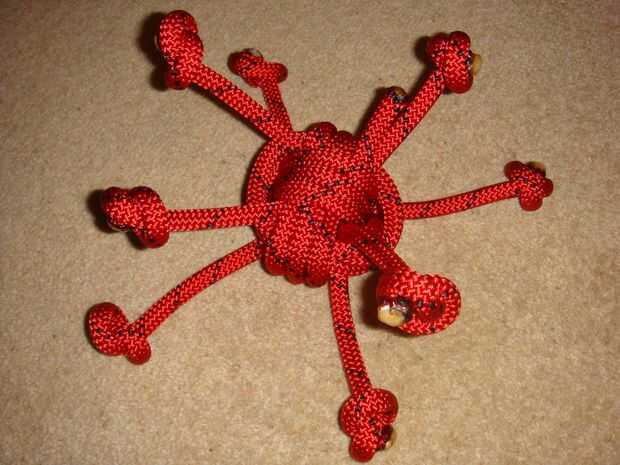 Los 4 bits m hacen los monos del puño y los 4 bits más pequeño hacen las colas. Tomar una cola y el hilo a través de la brecha en el puño de monos, en cada combinación hay es un espacio y en el nudo entero hay 8 en total. Cada cola va en un hueco y diagonalmente el espacio opuesto. Hacer esto con 4 colas todos por lo que en total hay 8 cabos sueltos. Apriete el puño monos alrededor de él y agregar nudos de tope, aunque las colas no son realmente aseguradas al puño no salen fácilmente, y si empiezan a deslizar que los nudos de tope evitar caerse completamente.