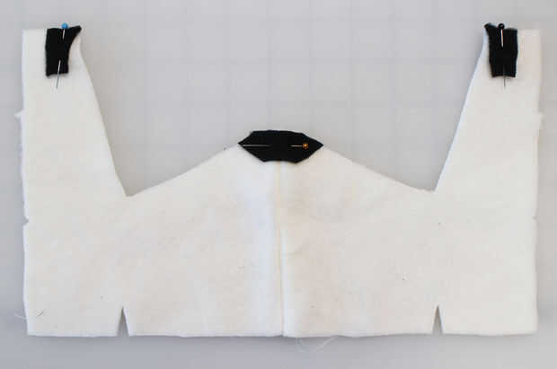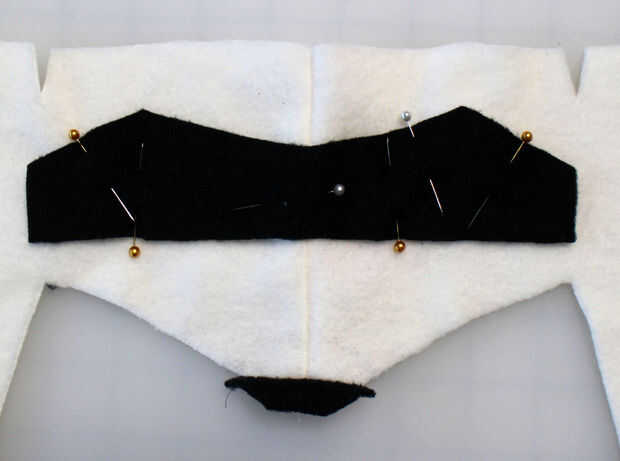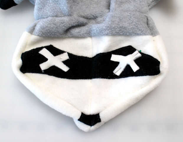 Agregar la máscara con una puntada de zig-zag (igual que las pistas de neumático) y coser las piezas de la nariz en el borde inferior de la cara (igual que los pies).