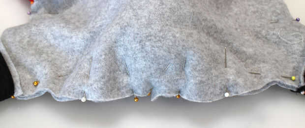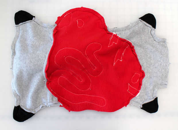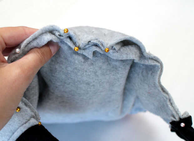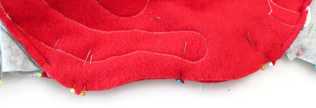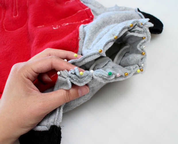 La cabeza también es fijada dentro del cuerpo y debe estar alineada con los triángulos. Colocar y prender las orejas entre la cabeza y el cuello, por lo que se cosen en su lugar al mismo tiempo la cabeza. La tela será 6 capas de espesor en algunos puntos, así que asegúrese de coser lentamente para hacer frente a la cantidad de material.