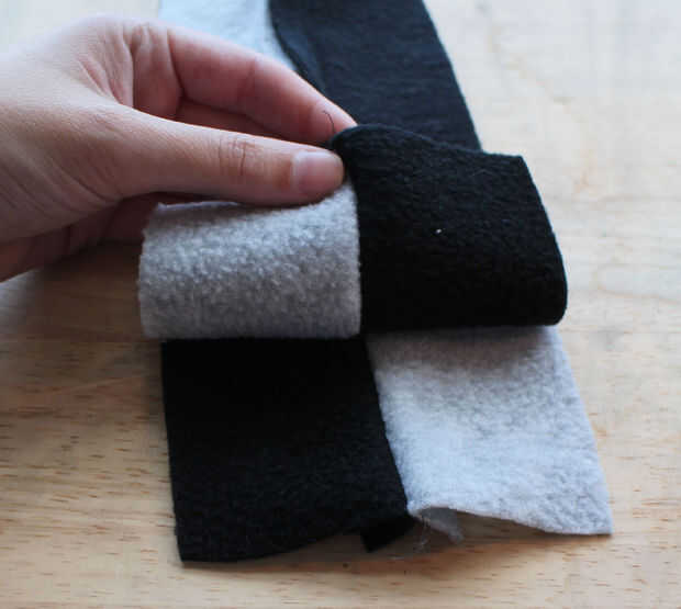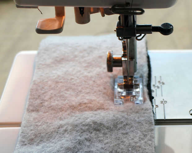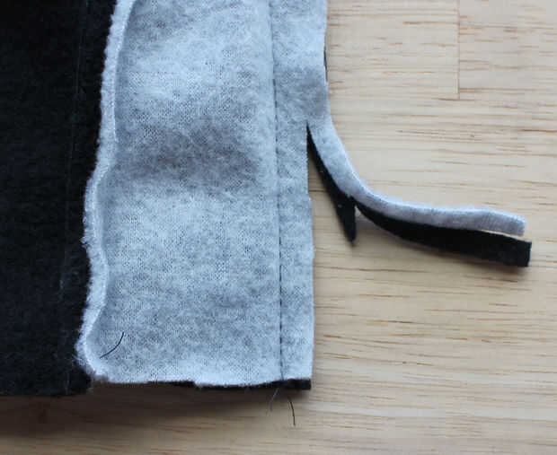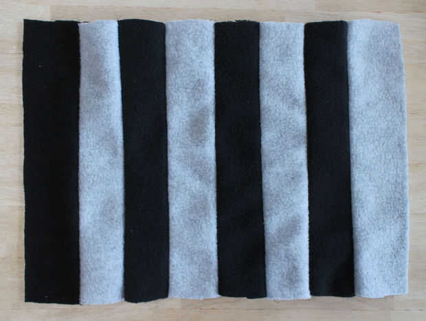 En lugar de luchar para alinear los bordes de las piezas de la cola, hice una sola hoja de tejido a rayas y luego córtela en la forma de la cola. Junte los lados de la derecha de la raya y coser por el borde largo. Continúe hasta que las rayas se han utilizado y recortar las costuras a aproximadamente 1/4"(o algo menos de 1 cm).