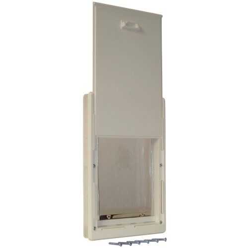 Para ambas puertas, he utilizado el medio de productos de Pet Ideal perro puerta. Se ejecuta $20 en Amazon y es bastante robusto. En nuestro caso con esta puerta, usé tratada a presión x 2 madera y una "chapa" de pino en el interior para hacer la diferencia. El 2 x 1-3/8" y la puerta es 1-3/4". Esta puerta también tiene una piel metálica en el exterior que necesita explicarse.