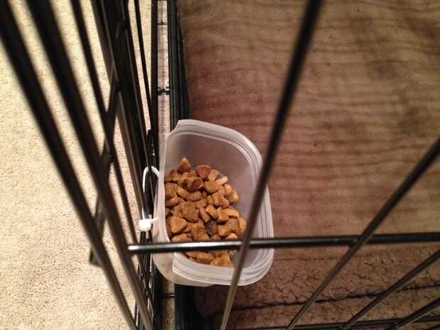 Sé, alimentación perros en sus cajones no es la mejor cosa a hacer, pero a veces no hay elección. Mis cachorros no comen su comida entre el momento que me levanto y lo que dejo para el trabajo, puede ser hasta de 18 horas entre las comidas! Y si no comen - tiran para arriba!! Tan para evitar el lío cuando llego a casa, he empezado a darles de comer medio "servir" en el cajón. Que sostiene hasta llegar a casa del trabajo, pero no es tanta comida que tienen que "ir". (no recomendado para chewers destructivas!)