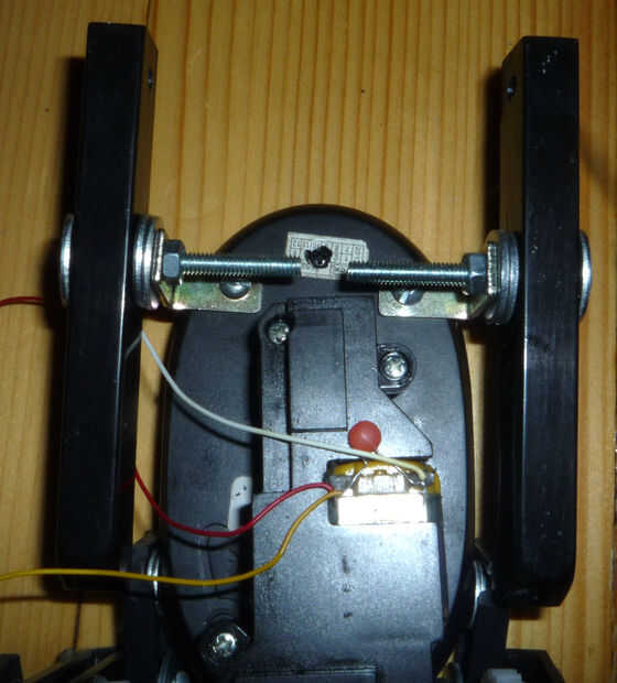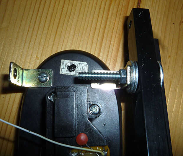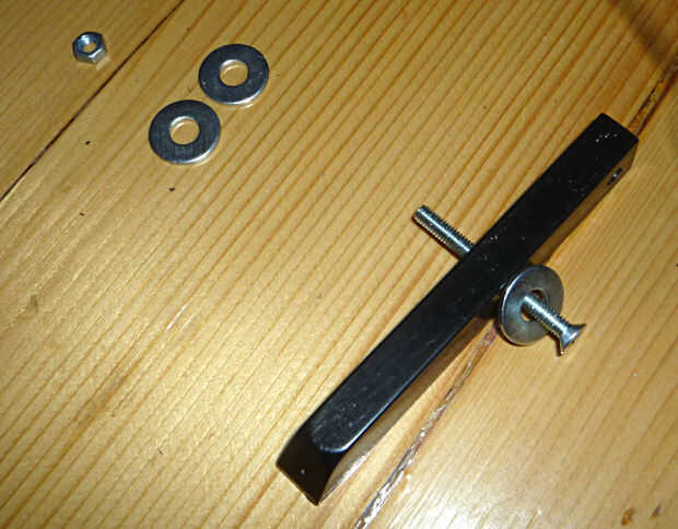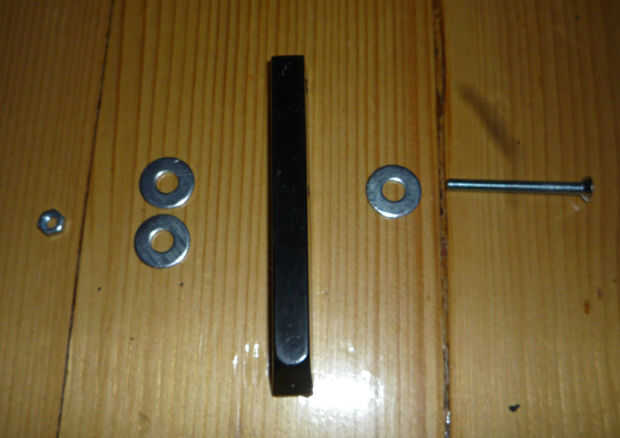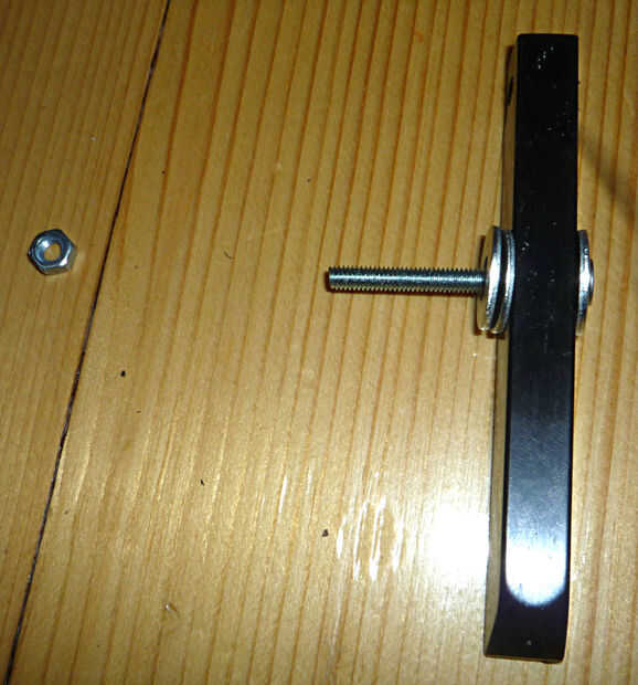 Ahora, con un tornillo, una tuerca y tres arandelas, une cada tecla a los ángulos metálicos. Es muy importante recordar que las llaves tienen que fijarse a través del agujero entre la parte superior y el centro. La articulación tiene que estar suelto.