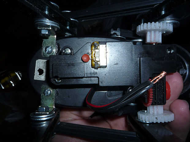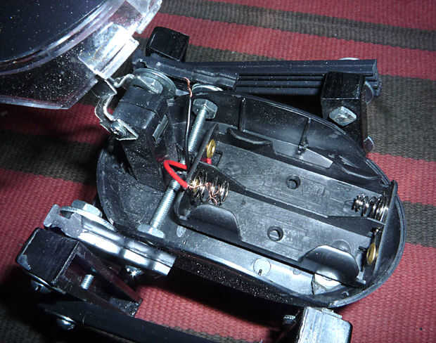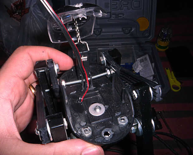 Yo solde dos cables a los pines del motor. Luego perforé un agujero para pasar los cables por el cuerpo. Coloqué la caja de pilas AA sobre el cuerpo. Entonces conecté un cable para el caso de las baterías y el otro irá a la cabeza del interruptor.