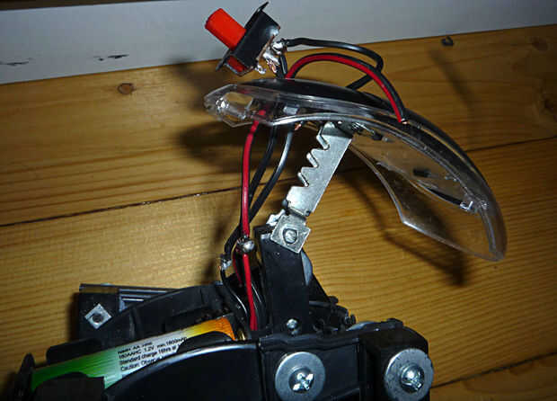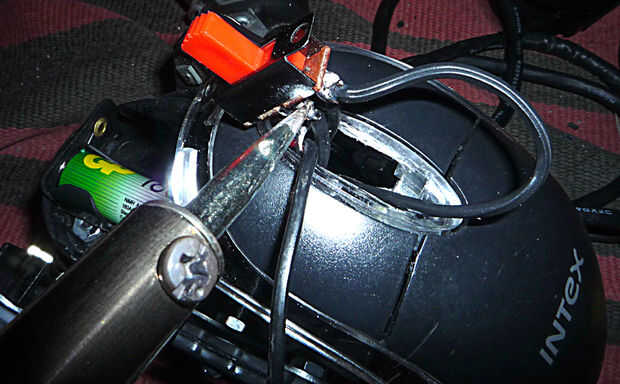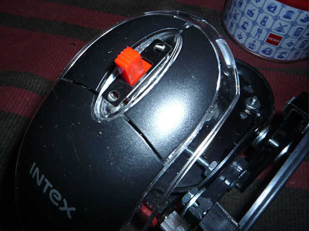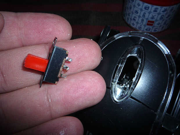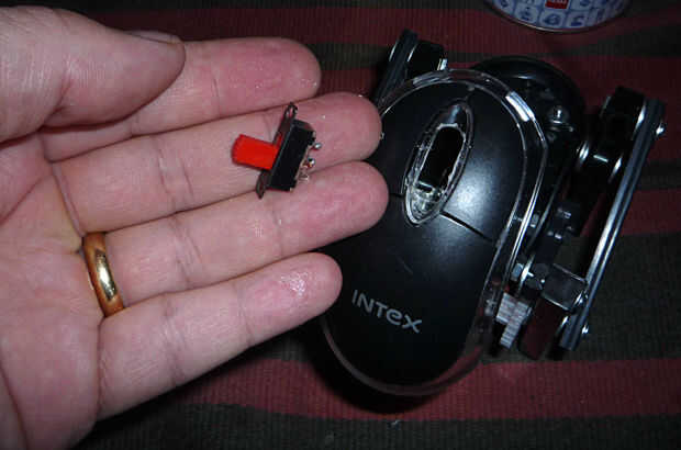 He puesto el interruptor en el agujero restante de ratones caja superior (cabeza). En el perno central, había soldado el cable que viene de la caja de baterías. En otro pin, había suelda el otro cable que viene del motor.