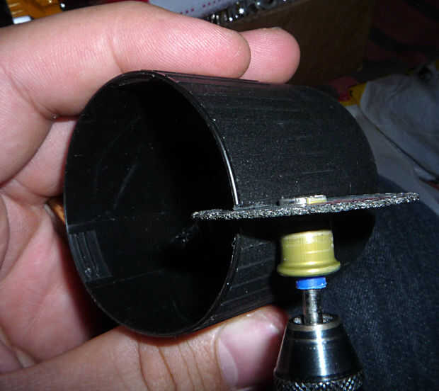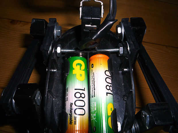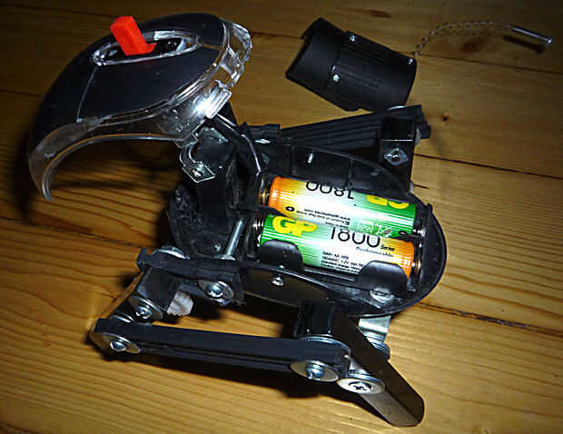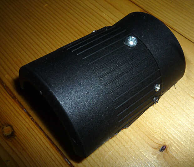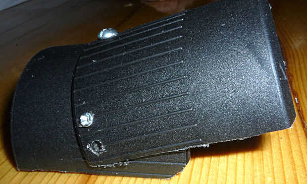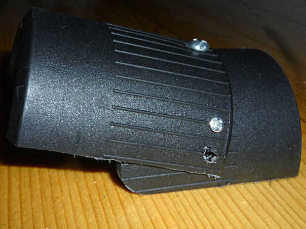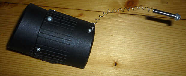 Utilizando un casquillo de un aerosol del cuerpo del hacha vacíelo (no mio), he hecho una cubierta de las baterías. Corté por la mitad, comprobar si cabe en el caso, luego me dio forma a la tapa y coloca el muelle como una cola. Para una fácil fijación y eliminación, puse dos tornillos en el cuerpo que encajan dos agujeros perforaron la cubierta.