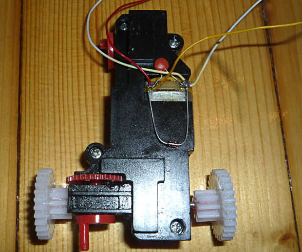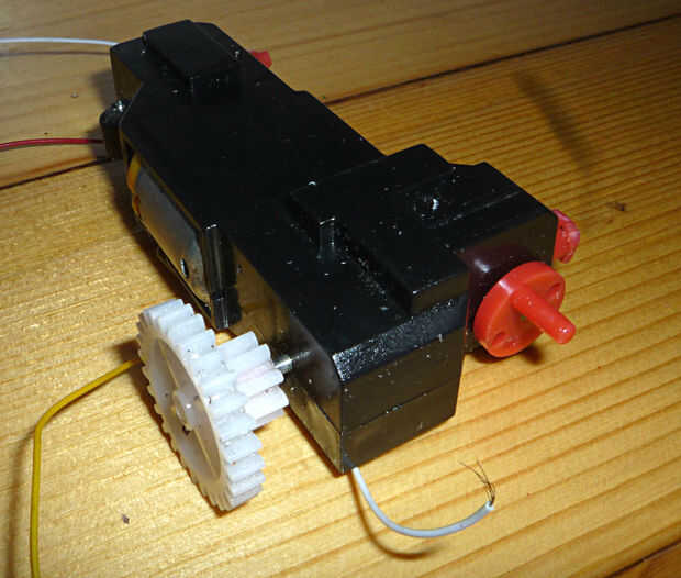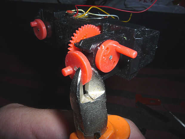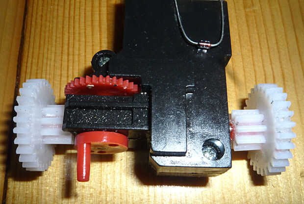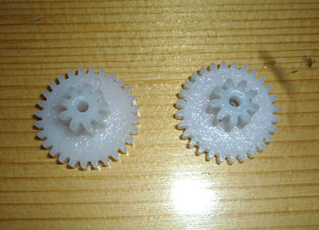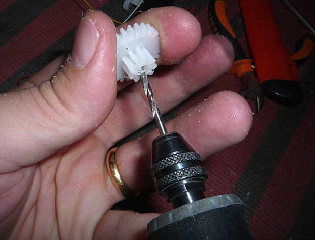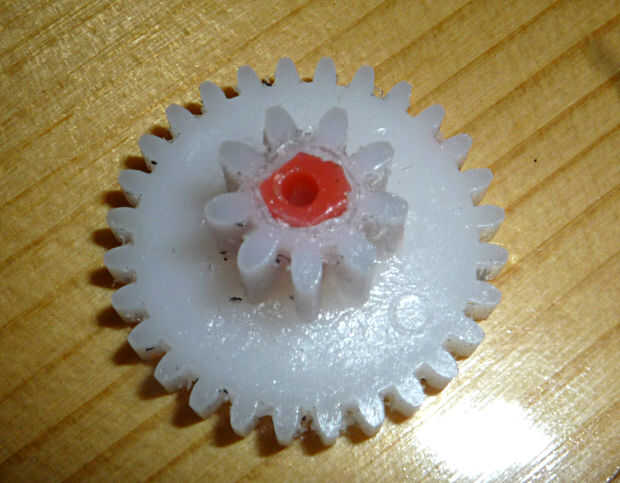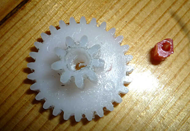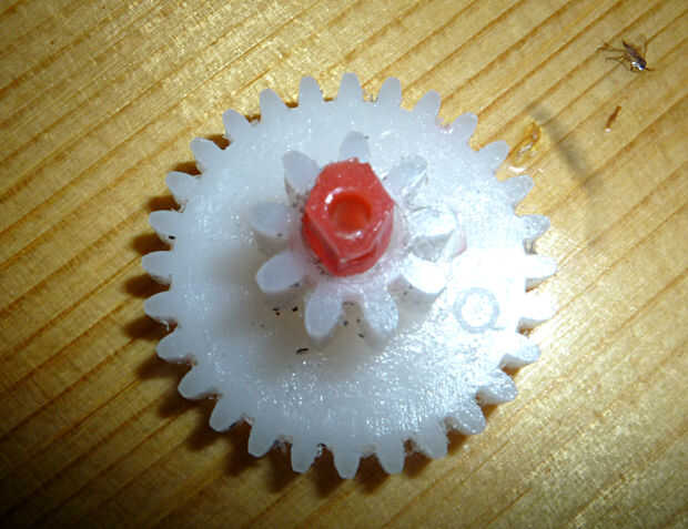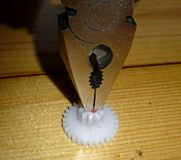 He modificado las piezas de plástico rojizas en cada extremo del eje principal, a fin de les hizo encajar en dos engranajes de plástico blanco grandes (no es obligatorio las piezas que los engranajes. Estos pueden ser discos, como están hechas de un plástico duro buena que no se rompe fácilmente). Incluso se amplió el orificio de los engranajes para conseguir una mejor fijación. He pulsado cada pieza roja en el equipo blanco, con la punta de los alicates y fija las piezas con pegamento.