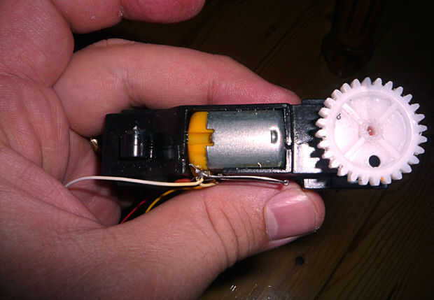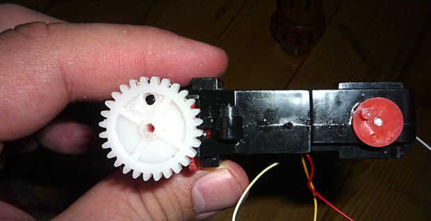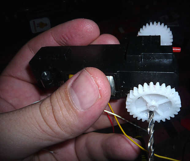 Taladré un agujero en cada rueda. Cerca de la frontera, pero no tan cerca. Ahora, hay algo importante: el perro robo caminatas alternando las piernas de un lado con las piernas de la otra. Para ello, el agujero de un engranaje debe ser exactamente opuesto del agujero de los otros equipos. Así, si en el equipo izquierdo perforar hacia arriba, en la que hay que desglosar.