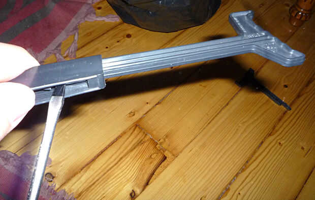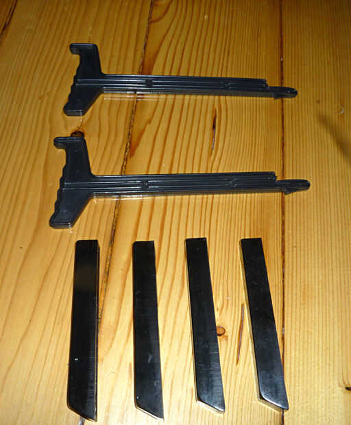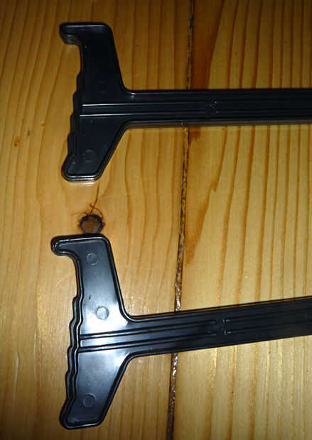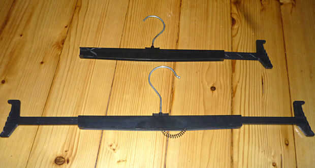 He encontrado algunas interesantes coathangers plástico. No el plástico mejor, pero lo suficientemente fuerte. Extraje dos T en forma de piezas. De cada uno, corté el segmento más corto (que se conectará cada pata delantera al cuerpo del perro) y mantuve una más larga para conectar cada pata delantera con sus respectivas patas posteriores.
