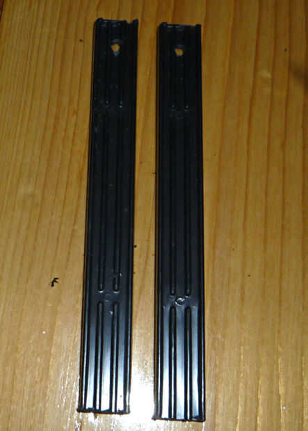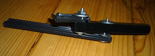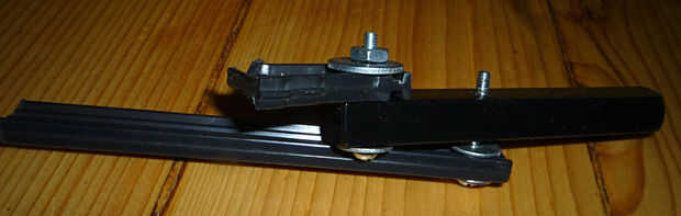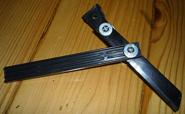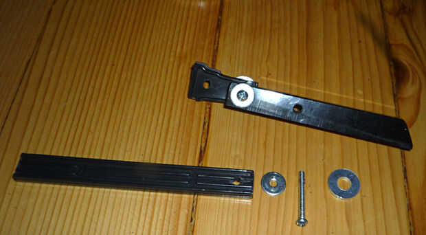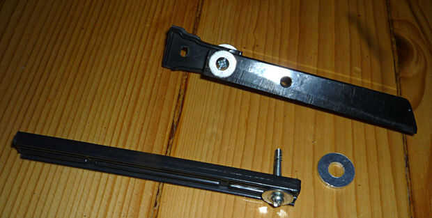 Taladré un agujero en uno de los extremos de piezas más largas de cada percha, y con un tornillo y arandelas, até a la pata delantera. Recuerde: Este empalme debe ser lo suficientemente flojo como para una buena articulación. El tornillo debe tener una parte para el siguiente paso.