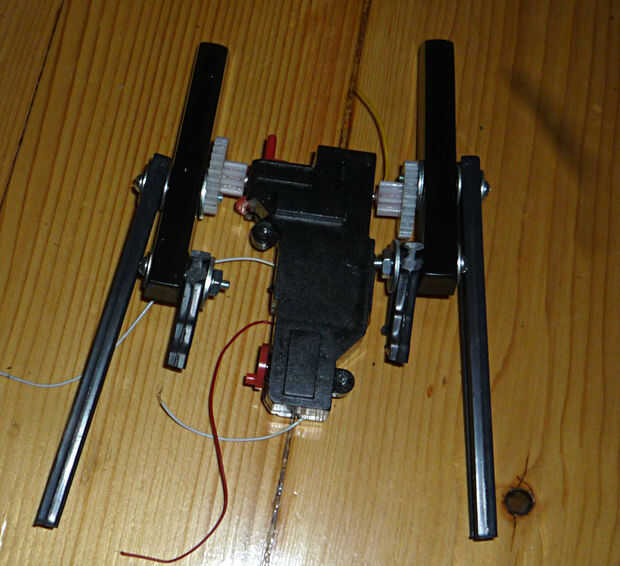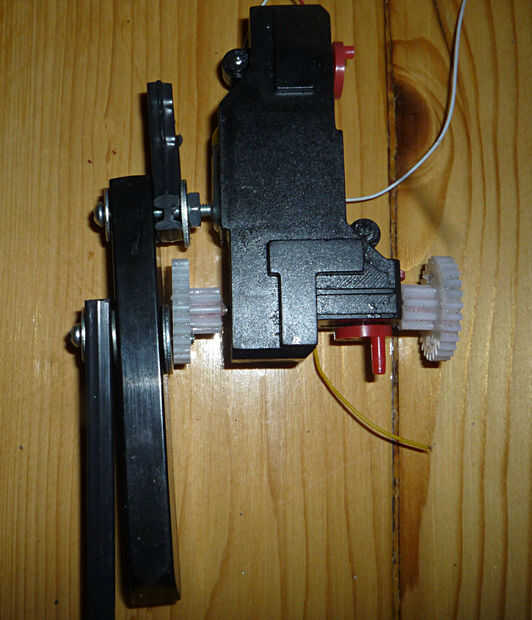 Os adjunto el tornillo situado entre la parte superior y la mitad de cada tecla del piano que estoy usando como patas delanteras. Esta articulación tiene que ser suelto, demasiado; pero el extremo del tornillo tiene que fijarse firmemente en el agujero del engranaje blanco grande.