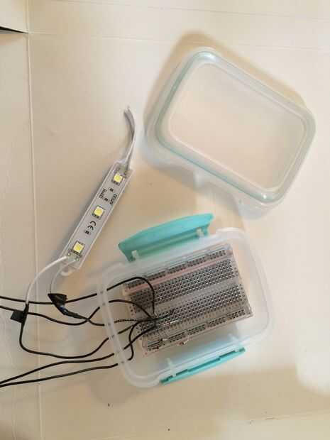 Cortar 2 longitudes cortas del alambre de conexión, todos los extremos de la tira y colocar dos en los extremos de los cables de LED. Sólo necesitan ser lo suficientemente larga para recorrer alrededor y en la base para fijar a la placa de tupperware.