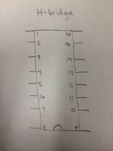 El puente H se centró primero en la Junta de soldadura. Nosotros entonces soldado lleva a clavijas numeradas 2, 3, 6, 7, 10, 11, 14 y 15, como se muestra en la imagen siguiente. Esto mantiene el puente de H en su lugar. Los cables pelados para tierra, 7,5 voltios y 5 voltios fueron agregados en la parte inferior de la Junta así. Patillas numeradas 1, 8, 9 y 16 fueron conectados con 7,5 voltios al alambre y pin número 5 fue conectada a tierra.