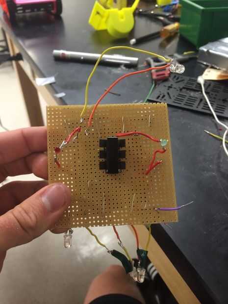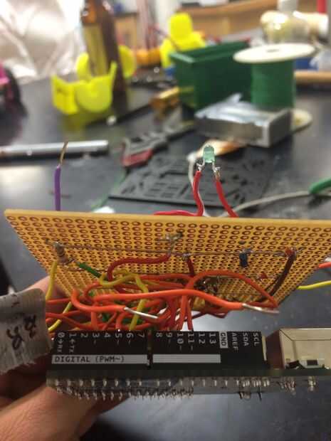 En este punto el Arduino debe descansar debajo de la soldadura con 3 fotodiodos que sale entre ellos y un interruptor, fotodiodo y el LED rojo y verde por encima de la Junta.