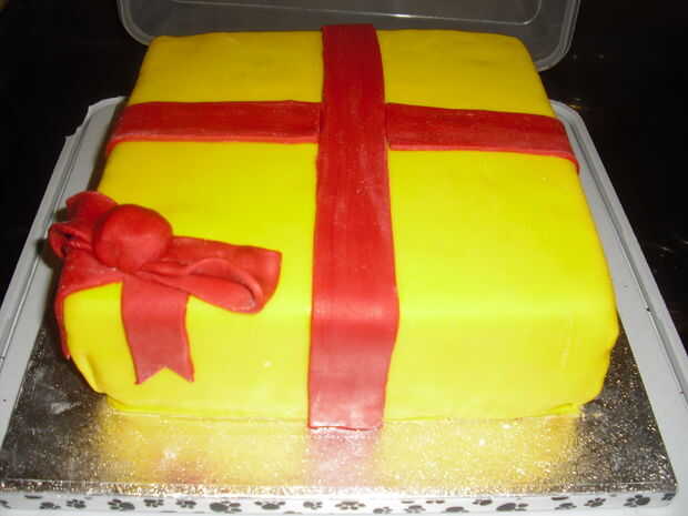 En primer lugar hacer un bizcocho cuadrado. Sandwich con mermelada y mantequilla glaseado. Decorar con contrastes de colores de glaseado de fondant para hacerlo parecer un regalo y coloque en un tablero de la torta (uso un poco de mantequilla glaseado para fijar el pastel a la Junta). Corte algunas formas alargadas triángulo de glasé del mismo color que el 'papel de regalo'. Algunos de éstos en figuras en forma de arco de la curva y dejar que se fijan en forma (estos serán el 'papel de embalaje arrancó' donde la cabeza del perro es saliendo del presente).