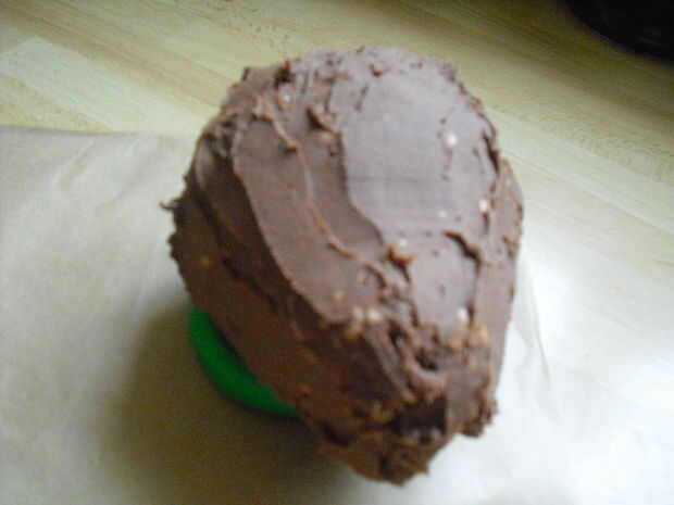 Glaseado de mantequilla chocolate liso en una fina capa por toda la cabeza.