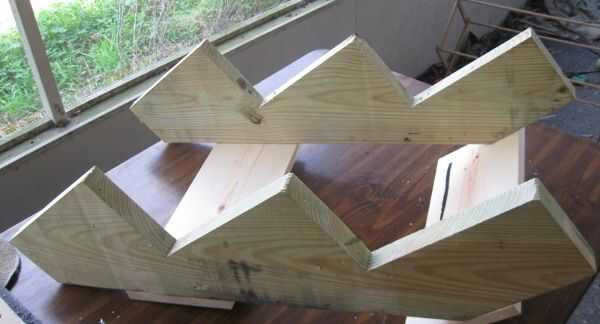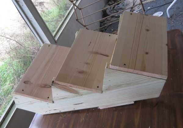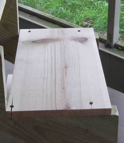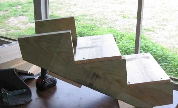 Enrosca en cada uno de los 3 pasos (12" largos de 1" x 10" Comité), esta vez utilizando los listones ya diseñado (más inclinado, más abajo). Usé 4 tornillos (uno en cada esquina) para la parte inferior y mediados pasos. Usé sólo 2 tornillos en el escalón superior, dejando la parte de atrás suelto. Llegaré a eso en un momento.