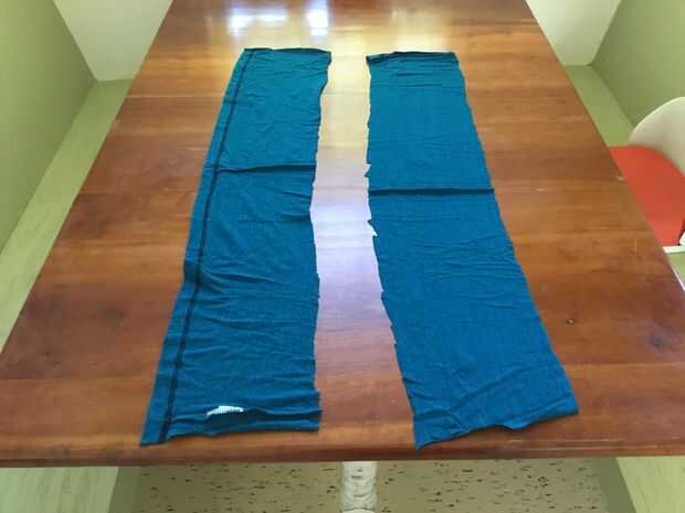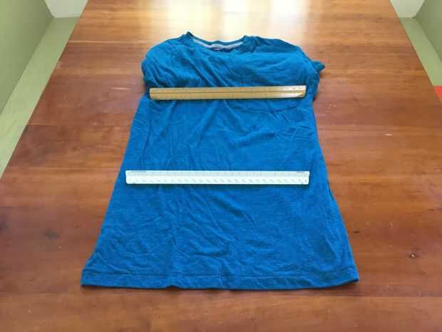 Para este paso necesitan cortar dos tiras horizontales de camiseta debajo de las mangas. Si tienes una regla, siga adelante y mida dos longitudes iguales debajo de las mangas y márquelos. (Yo usé las reglas como marcadores una vez que ha determinado las líneas) Si no tienes una regla, calcular el centro de la camiseta de la parte inferior de las mangas a la parte inferior de la camiseta y haga una marca allí. Estas marcas determinará la línea de corte. Cuando haya terminado la marca de medición, corte horizontalmente a través de esa línea y en la parte inferior de las mangas, así que tienes dos tiras iguales. Las tiras deben ser capaces de formar un círculo y aún conectado. Atraviesan verticalmente al lado de dos de las tiras para hacer una tira grande.