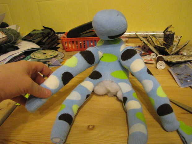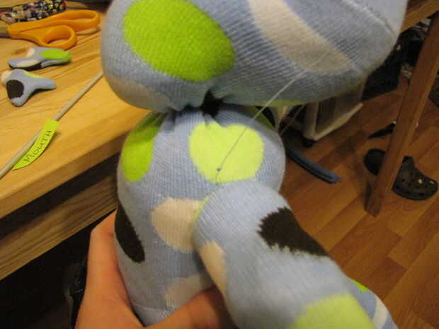 Después de que te has ido alrededor del brazo, haga un nudo y enterrar el nudo en el relleno. Así que el nudo de 3/4 de pulgada hacia fuera del brazo, entonces simplemente hundir su aguja en el brazo y por el otro lado. Tire un poco, cortar el hilo y el nudo va a ser dentro de un lugar y la cola del hilo de rosca se hundirá en el brazo. Hago esto con la mayoría-coser a mano... está impecable, no tiene nudos que muestra.