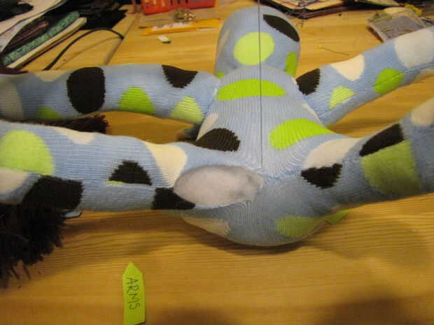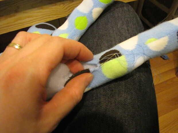 Este es un perro que hice hace años, con mi madre. Él hizo de calcetines gris y blancos y un calcetín entero para su cuerpo. Sus ojos y nariz son botones. ¿No es lindo?