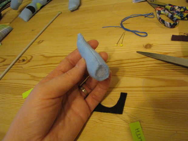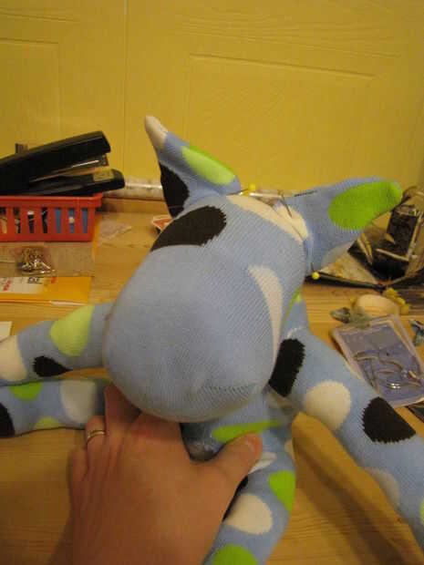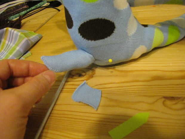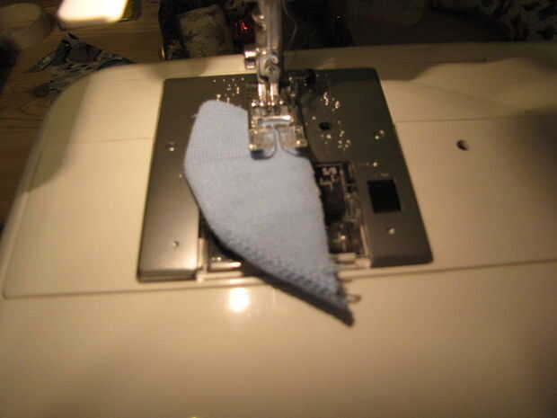 Con el desecho del talón del segundo calcetín, doblar en forma de V estrecha, puntiaguda y coser, dejando abierto el extremo ancho de la V. Recortar un smidge del punto de la V, girar a la derecha hacia fuera y esas cosas. Posición donde sería como en el perro y coser a mano.