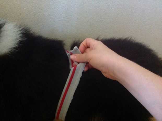 Medir la barriga del perro con la hebilla o tira Coser la tira o hebilla en el borde de la mochila Llenar la mochila con comida y agua para su perro Ate la cuerda y botón de la solapa