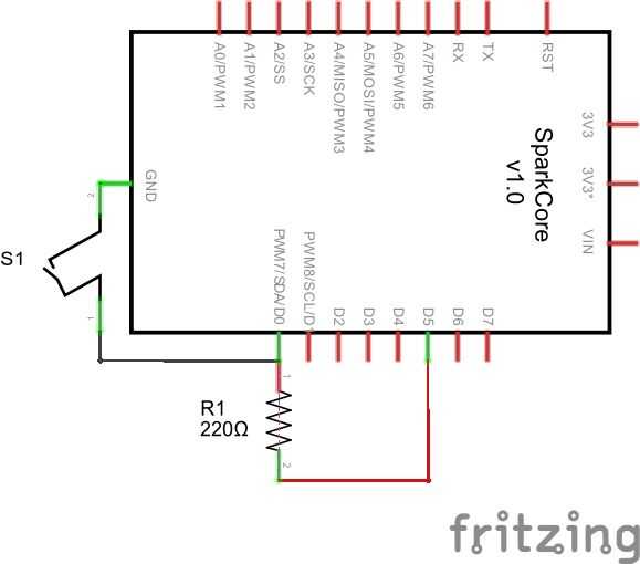Este simplemente circuito que corriente fluirá a través de los caminos de menor resistencia. Usted puede de manada la gente decir "electricidad toma el camino de menor resistencia," está discutiendo una circunstancia donde los caminos difieren considerablemente en la resistencia, como una mano húmeda vs un boquete de aire. Un interruptor permite este espacio de aire y como la corriente fluirá entre D0 a través del resistor de 221 Ohm a D5 cuando el interruptor entre D0 y el suelo está abierto. Cuando el interruptor está cerrado y porque la resistencia 221 Ohm es que mucho mayor resistencia a prácticamente toda la corriente fluirá a través del interruptor que tiene cerca de 0 ohmios.