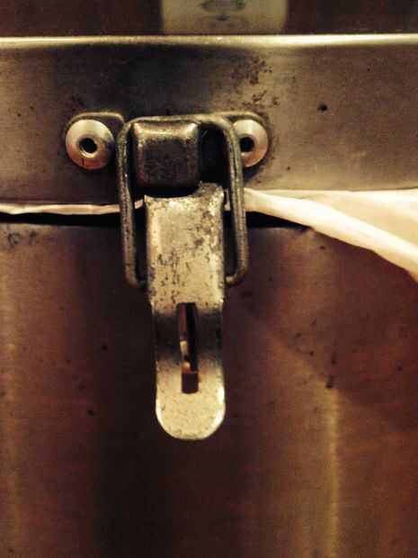Perforado 1/8 de pulgada los lugares marcados y sujeta la cerradura a la lata con remaches pop. Eso es todo.