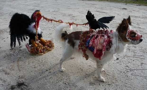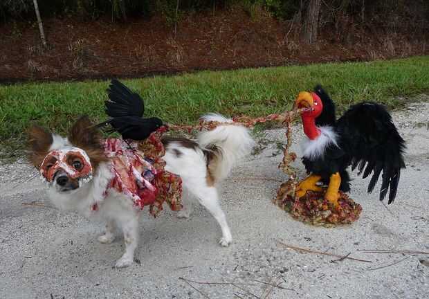Añadido protuberancias (hechos de tiras de espuma de poliestireno y yeso), en la parte superior para dar el efecto de una espina y me adjunta un cuervo pequeño orientado hacia el dorso de la silla. Los intestinos fueron creados por un patrón de zig-zag ancho 1" de corte en pequeñas burbujas, convirtiéndose en una larga duración. Luego rodar y atarla cada pulgada con rosca hasta entonces tener longitud que desee. Luego había suspendido de dos puntos con línea de pesca y poner una capa de látex líquido sobre él. Deje que seque durante la noche. Coloque al azar en cada lado en las zonas detrás de las costillas, tratando de hacer que se vea como si está desbordándose. Virar en su lugar con pegamento caliente a medida que avanza. Usted necesitará suficiente para crear una pila que el buitre se pare sobre y una longitud entre su pico y los cuervos, para que tengan una tug-o-guerra con los intestinos como el zombi perro deambula buscando gatos! Añadir otra tira en el otro lado del pico vulures que hasta la pila que se encuentra en los senderos.