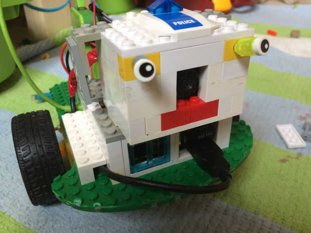 Conecte el cable USB Webcams al frente del bot, utilizando los orificios de acceso que creaste. Usted puede asegurar el alambre para el robot mediante la creación de algunas viviendas de Lego. También acortó el cable USB por el corte y volver a soldarlo, pero hacerlo sólo si realmente tienes ganas de soldar 4 minúsculos cables entre sí. Podría ser más fácil comprar un corto cable USB y conectarlo a la parte posterior de la cámara.