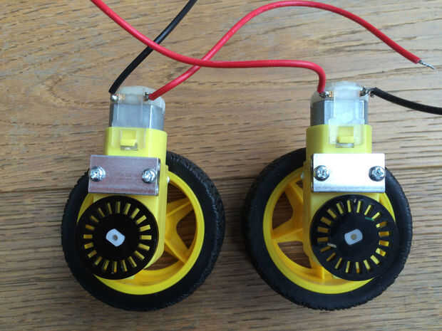 Ahora montar las ruedas. Siga las instrucciones del fabricante. Las ruedas que compré tenían todas las instrucciones en chino, que no puedo leer, pero es bastante fácil de descifrar por las fotos. Una vez montado conectar los cables al motor con una pequeña gota de soldadura.