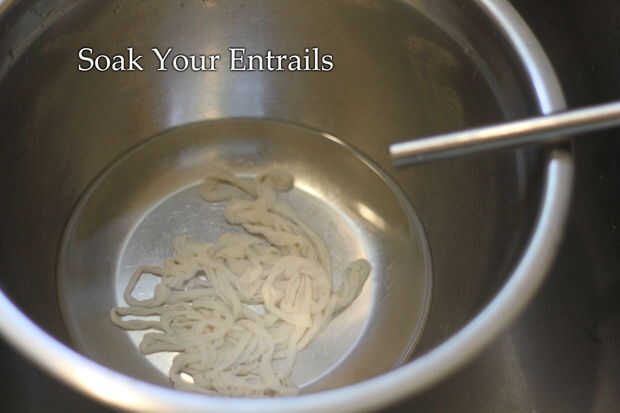 Remojar la tripa en agua un poco extraer parte de la sal se embalan en. Tal vez 15 a 30 minutos.