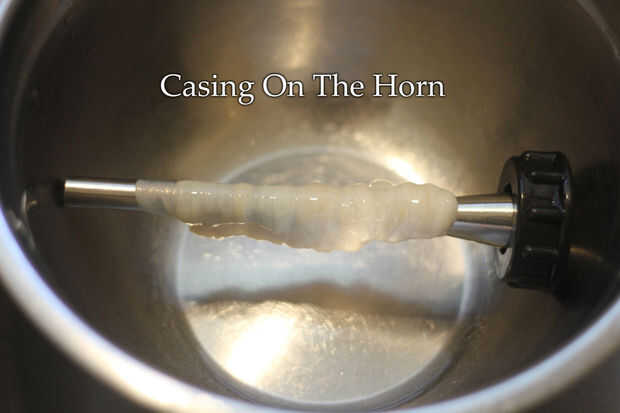 Iniciar la carcasa sobre la bocina (que es esa cosa llamada... bocinazo) y luego deje correr agua a través de la carcasa. Esto ayudará a lube a la caja para que se deslice fácilmente en el cuerno y ayudarle a encontrar cualquier huecos o nudos en su cubierta.