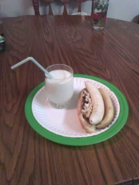 Utilizando mi creatividad y ingenuity(not), rápidamente se dio cuenta de que yo podría hacer algo de perro caliente de plátano bun-maní mantequilla-trail mix!