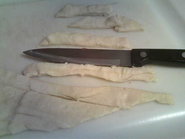 Cortar un rollo crescent en tiras. Creo que cualquier masa galleta funcionaría, sólo podría tener que quejarse con él más.