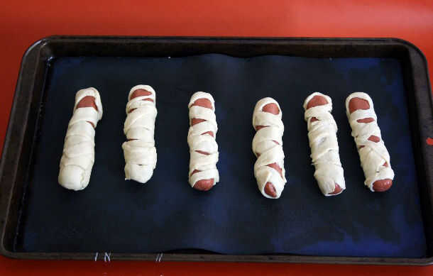 Una divertida idea para tu Halloween Haz reuniones!Fuente: http://www.rhodesbread.com/Recipes/View/2461Impresión: http://www.rhodesbread.com/recipes/print_recipe/2461Paso 1: ingredientesRollos de cena Rhodes, descongelado pero fríoperros calientes de