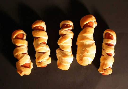Una divertida idea para tu Halloween Haz reuniones!Fuente: http://www.rhodesbread.com/Recipes/View/2461Impresión: http://www.rhodesbread.com/recipes/print_recipe/2461Paso 1: ingredientesRollos de cena Rhodes, descongelado pero fríoperros calientes de