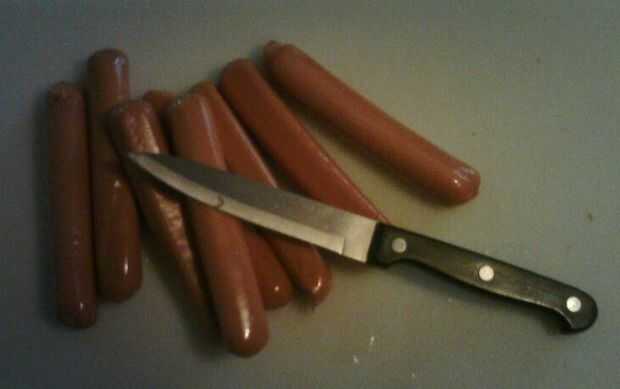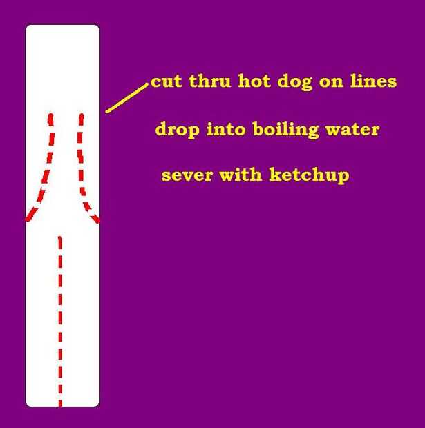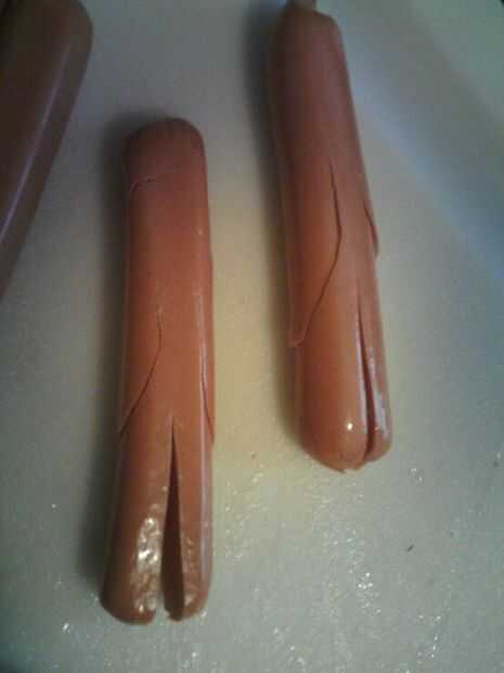 Empezar por cortar las salchichas como se muestra. (esquema proporcionado) Es divertido hacerlos