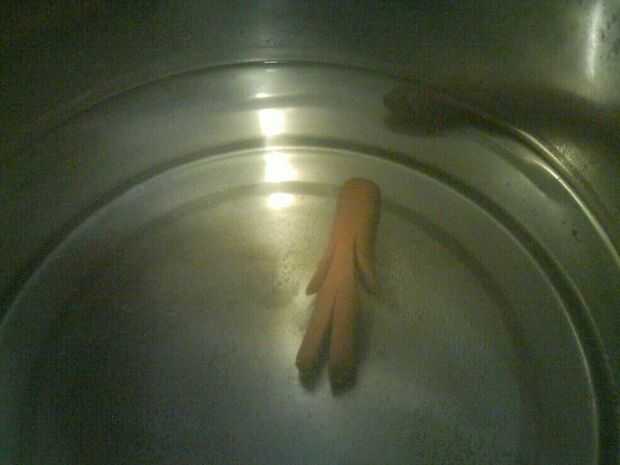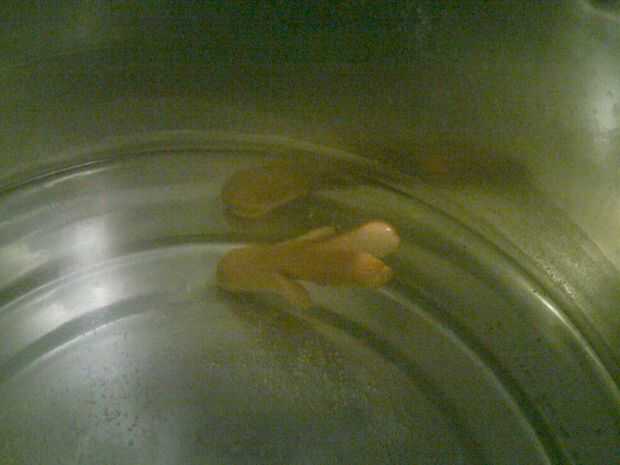 Caer el lil' guy en el caliente, agua caliente. Mientras cocinan, los pequeños brazos y piernas comienzan a