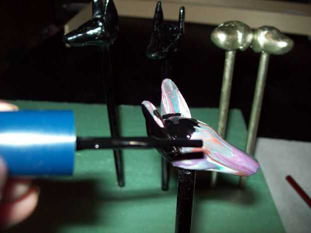 Pintura de los perros. Me gusta usar esmalte de uñas para pintar Sculpy ya no pela como pinturas de arte puede, y procede en una deliciosa gama de colores metalizados para borrar. Usé el negro (siempre disponible en Halloween) para el oro para los perros y chacales. Negro era el color tradicional utilizado por los egipcios para chacales aunque en la vida real los critters son luz marrón medio. Pinté la cosa entera, cabeza de perro y palo (excepto el final donde estaba sujetándolo)) y atrapado en un trozo de espuma de poliestireno que se seque. Usar 2-3 capas dependiendo de la cobertura. Una vez finalizado, volví y había pintado final que fue atrapado en la espuma de poliestireno.