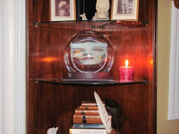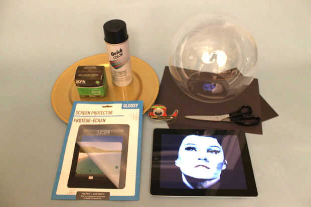 Esta hélice puede hacerse durante un fin de semana por muy poco dinero, particularmente si usted ya tiene un dispositivo de visualización, también conocido como ipad/tableta, etc.. La premisa es simple; Tome un globo acrílico destinado a una lámpara añadir una pantalla debajo de ella y luego coloque una hoja de plástico transparente en el mundo con un ángulo de 45 grados para reflejar la imagen hacia adelante. Eso es todo!