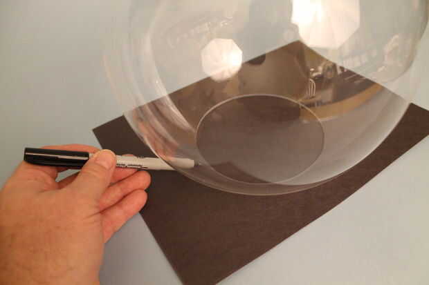 Tome un lápiz y trace la abertura del globo en la cartulina negra. Debido a la curva del globo el círculo traza será aproximadamente 1/4 pulgada más grande que la abertura en el mundo. Esto es lo que quieres.
