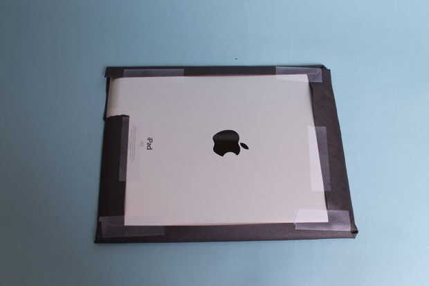 Alinee la abertura sobre la pantalla tan solo que aparece la cabeza. Doblar la cartulina negra alrededor de los lados del iPad y péguela en su lugar a la parte posterior. Corte el papel delante de los agujeros del altavoz para no ahogar el sonido.