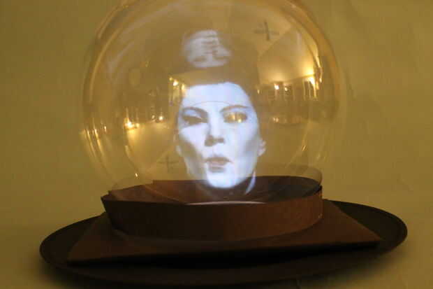 Prueba de ajuste la alineación colocando el globo sobre el iPad con Madame Leota mirando hacia fuera. La apertura en el mundo debe coincidir con la apertura en la cartulina negra. Si alinea bien y Madame Leota mira gran lugar Zots al borde de la abertura del globo y asegurar el mundo para el papel de construcción o iPad la cara.