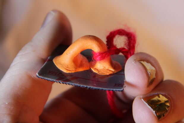 Agarra a su cartera de color brillantes sugru (utilicé un bonito naranja fluorescente). Toma y rodillo en un gusano poco agradable. Asegúrese de que sus lados son agradables y suaves. Luego plegarlo por la mitad y sujete los extremos a la parte trasera de la Plaza adhesivas de velcro formando un arco. Extiende a los bordes, asegurándose de que esté suavemente un montón de contactos de superficie de velcro detrás. Asegúrese de que el agujero es aún lo suficientemente grande como para dejar que la cadena a través de y no demasiado alto en interferir con sus movimientos. Que este siente por día para asegurarse de que esté completamente seca.
