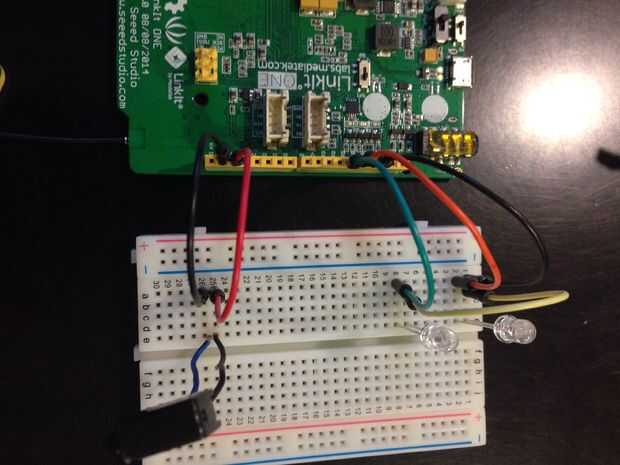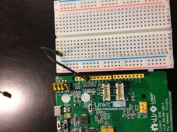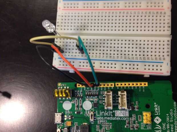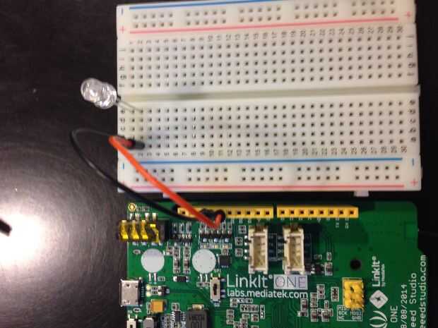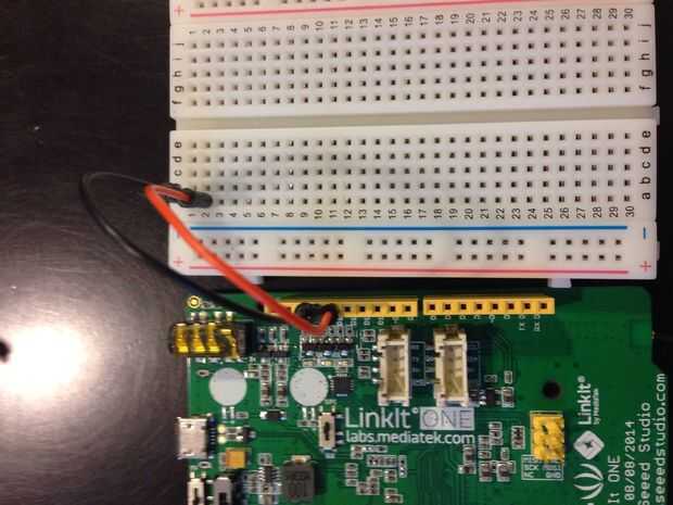 Coloque un cable de puente de la tierra digital a la Junta de pan (negro), así como de uno de los pasadores del conductor del LED (rojo). Asegúrese de colocar la pata larga del LED a la línea caliente de la placa de pan.